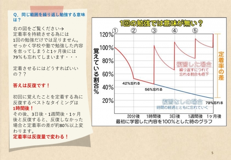 復習をいつかやると言って先延ばしにして1ヶ月後に反復しても79%の割合で忘れているので、学習が2回目でもほとんど最初から学ぶ必要があるということです!