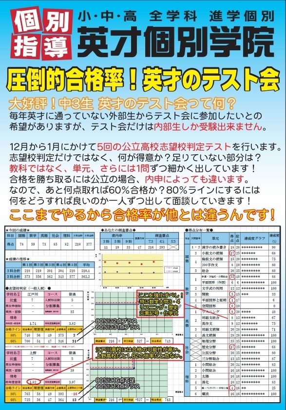 そこで塾独自に行うことによって、答案の返却は当日!願書を提出するギリギリまで点数UPに注力した結果を確認して志望校を決めることができます!