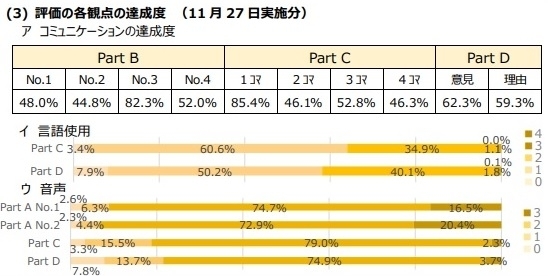 必要な情報を読み取って伝えることができていたが、「語彙、表現や文法を幅広く活用した伝え方」が不足していた。