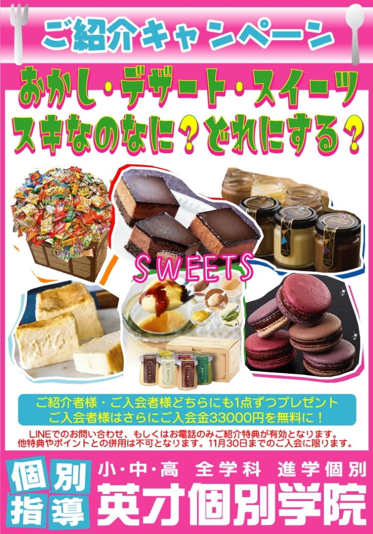 ♡♡塾をお探しのお子様をご紹介頂けましたらご紹介者様・ご入会者様どちらにもあま~いスイーツをプレゼント♡♡キャンペーンは11/30までなのでお忘れないようお早めに!※LINEでのお問い合わせ、もしくはお電話のみご紹介特典が有効となります。※他特典やポイントとの併用は不可となります。