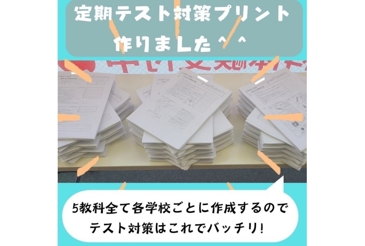 結構豪華なおかしもたくさん入っているのでどんどん自習して、お菓子もGET、良い点数もGETでいいことづくしですよ♪さらにさらに!当塾に通っている生徒さん全員にお渡ししている5教科分のテスト対策プリントもプレゼントしちゃいます!