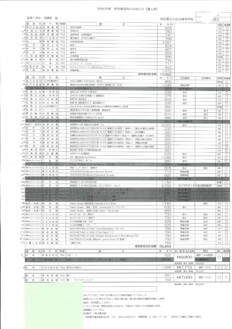 一例として、都立小山台高校の1年生の使用教材一覧を載せます。