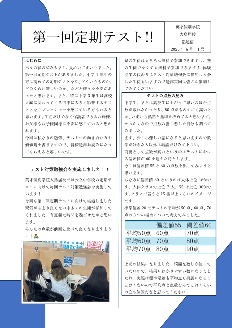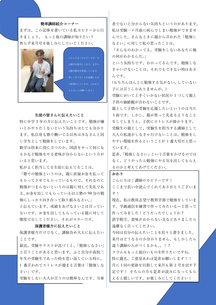 日頃、生徒の成績UPの為にご尽力をいただいているカビリ先生より塾通信を作成いただきました為、展開したいと思います!!