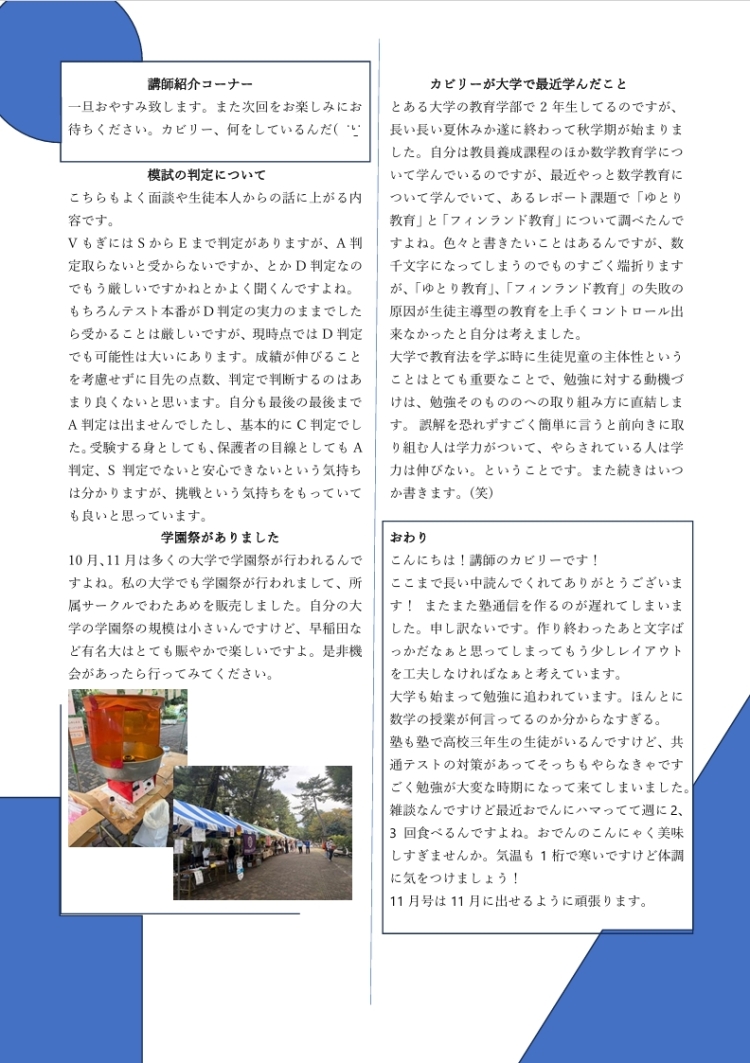 引き続き、日頃、生徒の成績UPの為にご尽力をいただいているカビリ先生より第五号塾通信を作成いただきました為、展開したいと思います!!