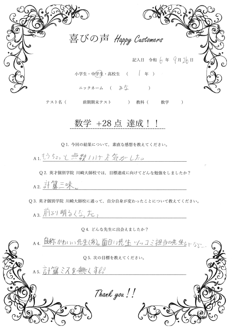 前期期末テスト 5教科合計 432点・数学 +28点!!