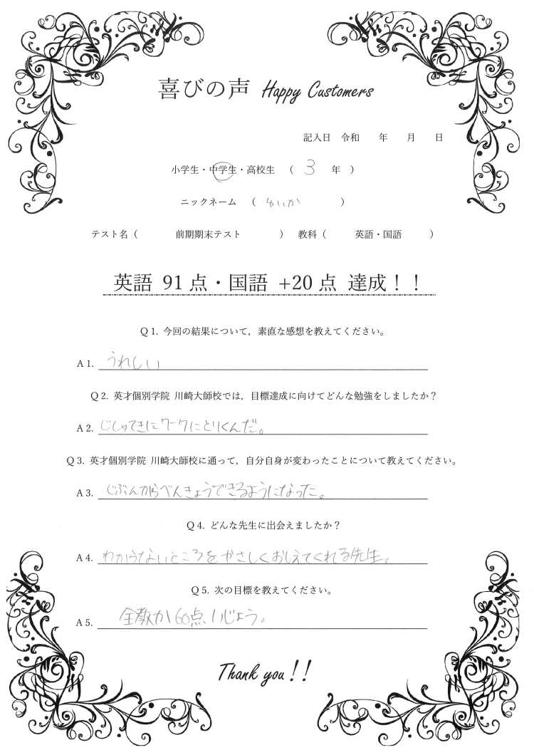 前期期末テスト 英語 91点・国語 +20点!!