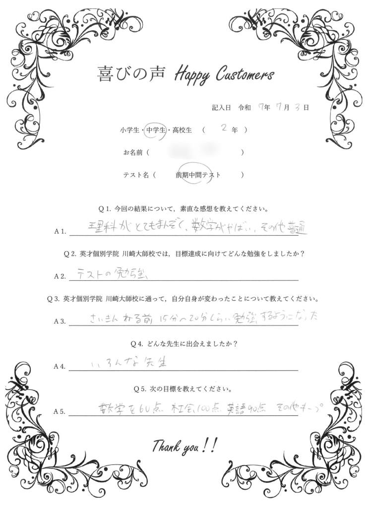 2025年度 前期中間テスト 理科 80点・社会 84点 達成!!