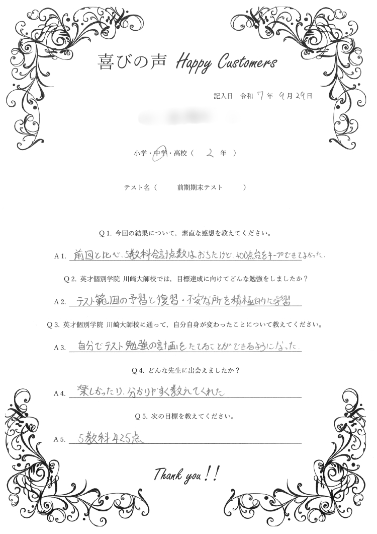 2025年度 前期期末テスト 5教科 合計404点 達成!