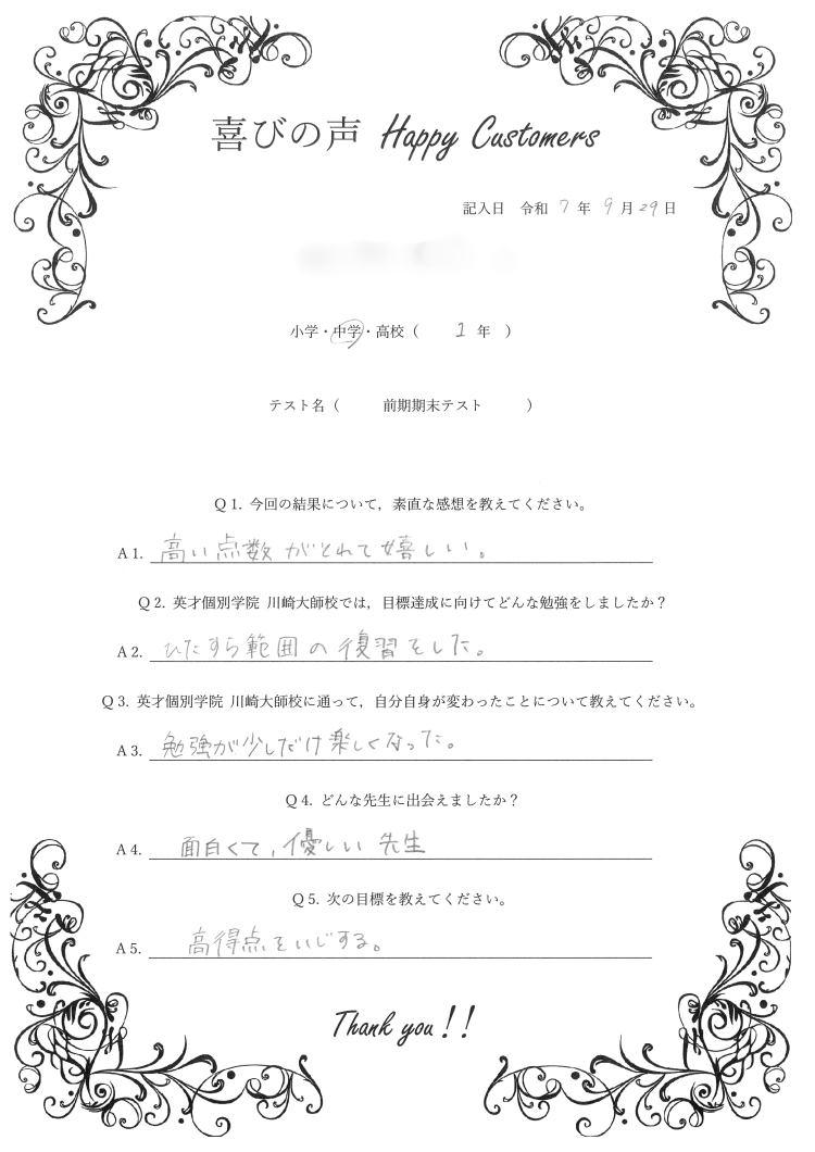 2025年度 前期期末テスト 5教科 合計460点 達成!