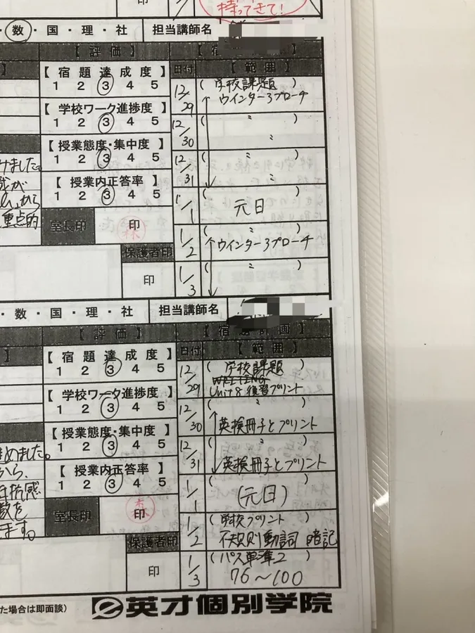 横浜荏田校では、このように日々やることを指示して、必ずチェックしています。
