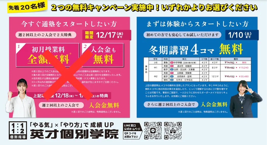 1/10(土)までのお申し込みで【冬期講習4コマ無料】❄️
