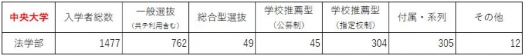 中央大学法学部の入学者総数1,477名のうち、共通テスト利用を含む一般試験で入学した人数は762名と約52%です。