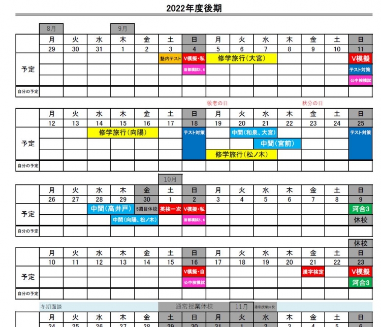 8月末から中学生以上の生徒さんにはこのようなスケジュールをお渡ししました。