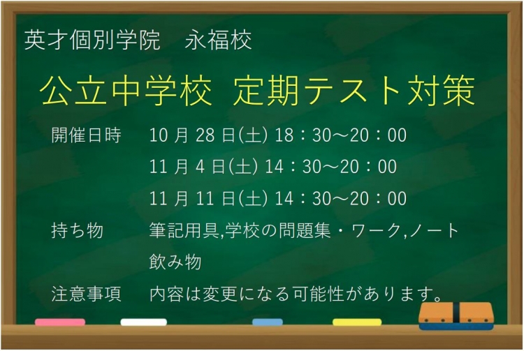 英才個別学院 永福校では以下の日時で公立中学校2学期期末テスト対策を実施します。