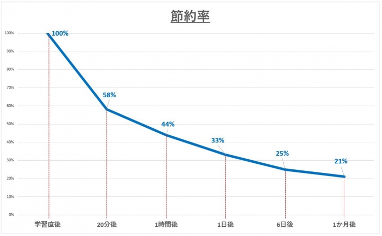 すなわち、最初に意味のないアルファベットを覚えるのに60分かかったとして、1日後に同じものを暗記し直そうと思ったら節約率が33%なので約40分で覚えられる、ということを表しているグラフなのです。