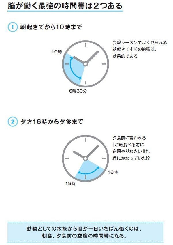 脳が働きやすい時間帯は朝食、夕食前の空腹の時間帯になります。