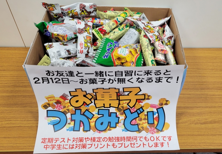 肝心の企画の参加方法等はこちらになります。友達を誘って一緒に自習室で85分以上勉強するとお菓子のつかみどりができます♪