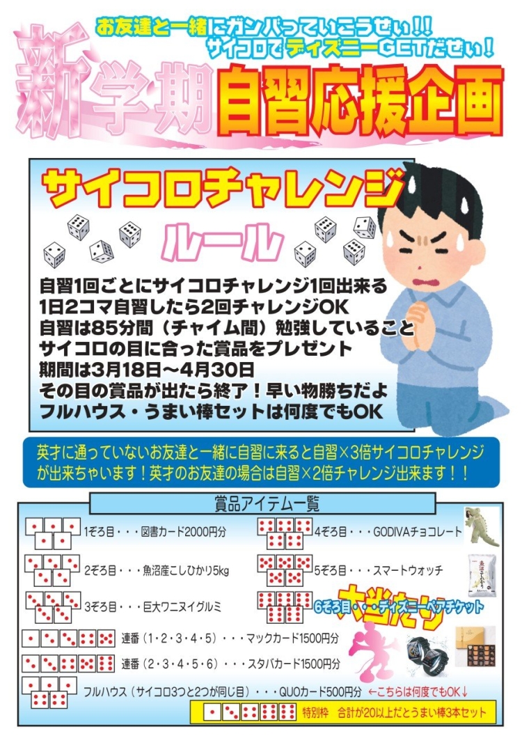英才に通っていないお友達と一緒に来ると自習×3倍サイコロチャレンジが出来ちゃいます!