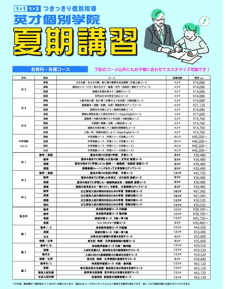 今回はそんな疑問にお応えすべく講習を受けて頂く目安として学年別、科目別のコースをご紹介いたします。
