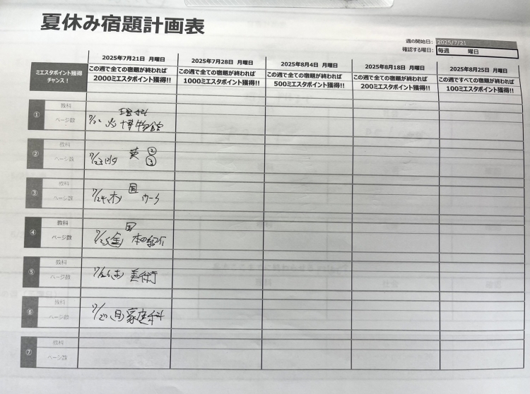 夏休みの宿題を計画的に終わらそう!というコンセプトを基に英才個別学院、東長崎駅前校の宿題管理の様子をお届けします。