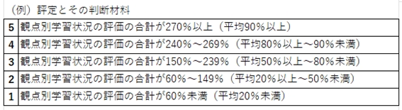 この達成度によって評定は決められますが,そのつけかたは,観点別学習状況の評価の合計で決める学校が多いです。