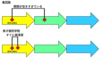 カリキュラムについて指導していく単元の流れは集団塾と基本的には変わりませんが,ここが集団塾と決定的に違うという点が一つあります。集団塾も個別指導塾も同じ単元を何回かに分けてスパイラル方式で学習していきますが,集団塾では苦手な単元をもう一度学習するまでの期間が長すぎます。特に系統的な算数では,同じ単元であっても2回目は応用発展になるため,最初のつまずきは致命的になりかねません。