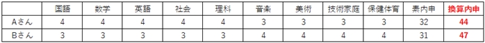 ②実技教科への取り組みもう1つは,実技教科(音楽・美術・技術家庭・保健体育)を疎かにしてはならないということです。受験勉強を開始すると,どうしても試験科目である5教科を中心に考えてしまいがちですが,都立の推薦入試や一部の私立推薦入試では,9教科の合計で合否が判定されます。また,都立一般入試においては実技教科の内申は2倍されます。例えば,通知表において数学の5は5点で計算しますが,音楽の5は2倍の10点として計算してします(これを換算内申といいます)。下の表において,5教科がオール4で実技教科がオール3のAさんと,5教科はオール3で実技教科がオール4のBさんを比較すると,一般入試で使う換算内申はBさんの方が高くなります。