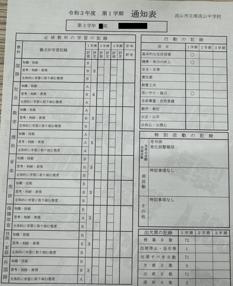 ↓夏期講習後の統一テストでは↓10月の千葉県統一テスト:5科目偏差値54(+7)偏差値と通知表がそろって上がり、最終的に松戸国際高校に合格!