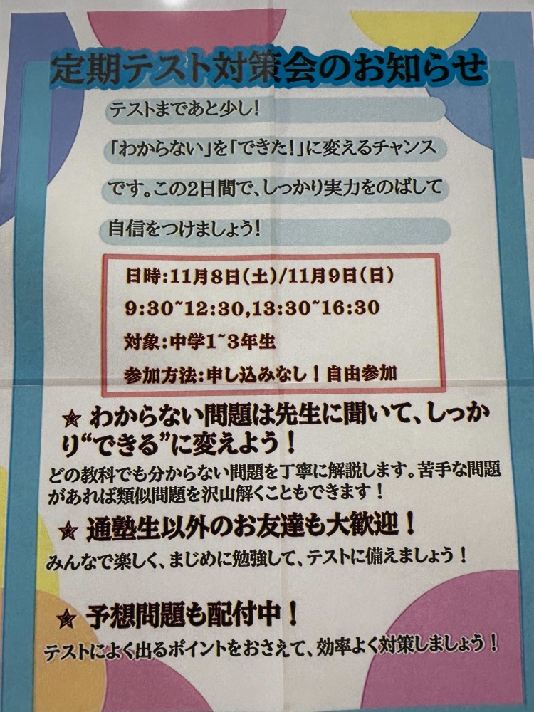 テスト対策会は本日11月8日(土)だけでなく、