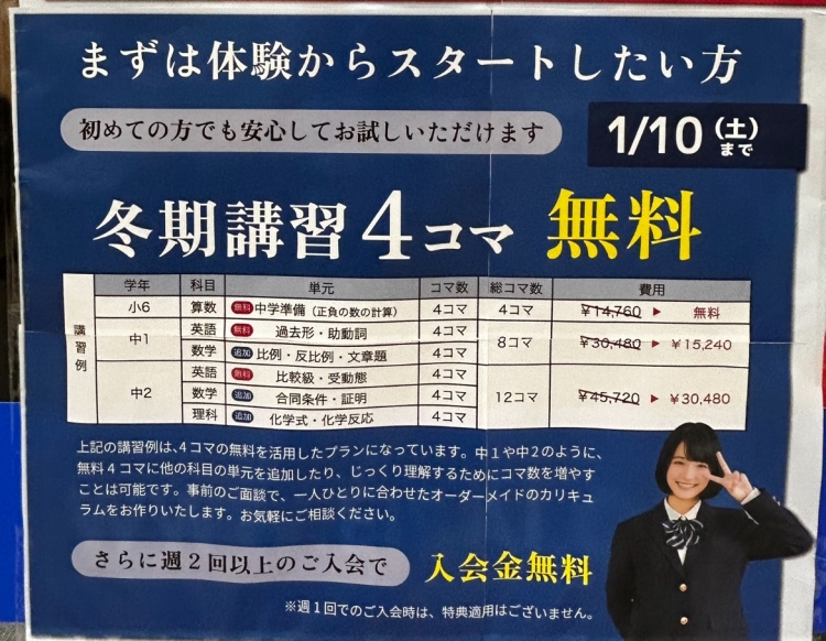 冬期講習期間となり、入会キャンペーンも行っていますので、この機会にぜひお気軽にご相談ください。
