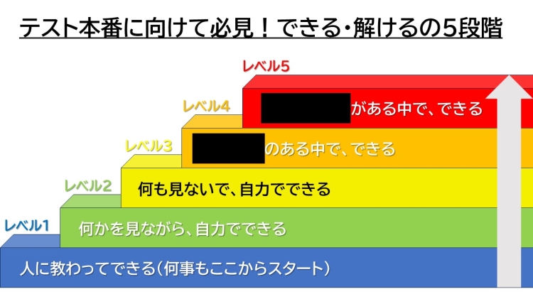 教室ではテスト本番期間に入るからこそ、5つの「できるレベル」を意識して授業を行っております。↓