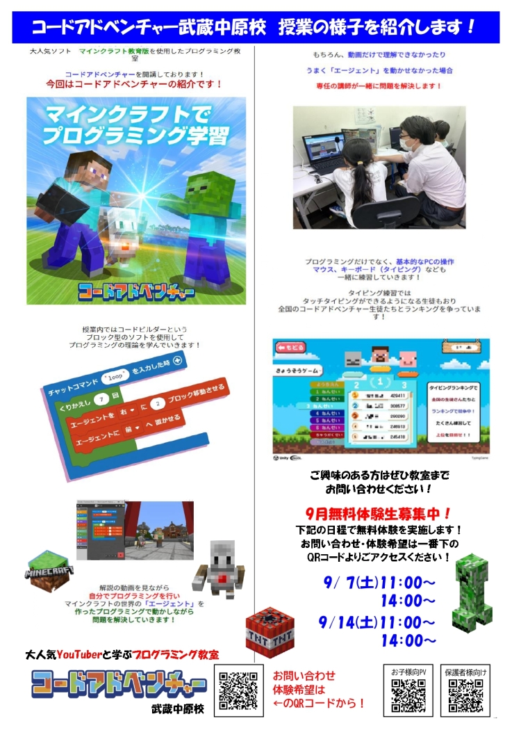 ↑はコードアドベンチャー武蔵中原校のものです。武蔵中原校はマインクラフトによるプログラミング教室も併設しており、教室長の多喜はこちらの責任者も兼務しています。火曜と水曜の授業も担当しています。