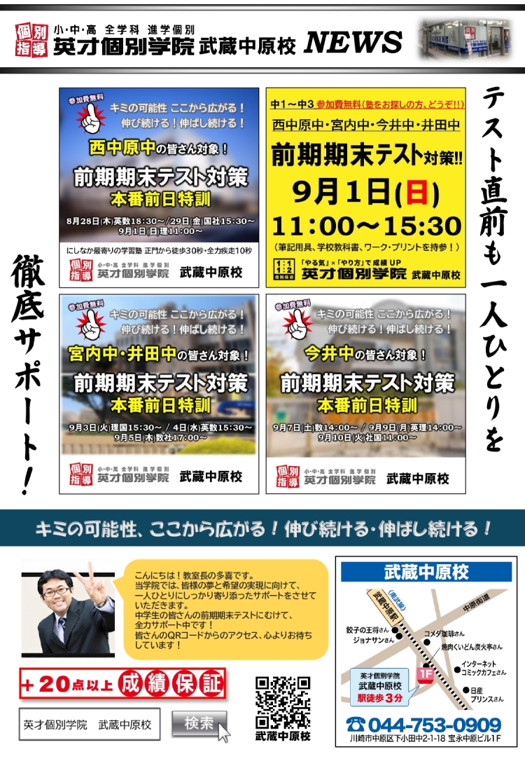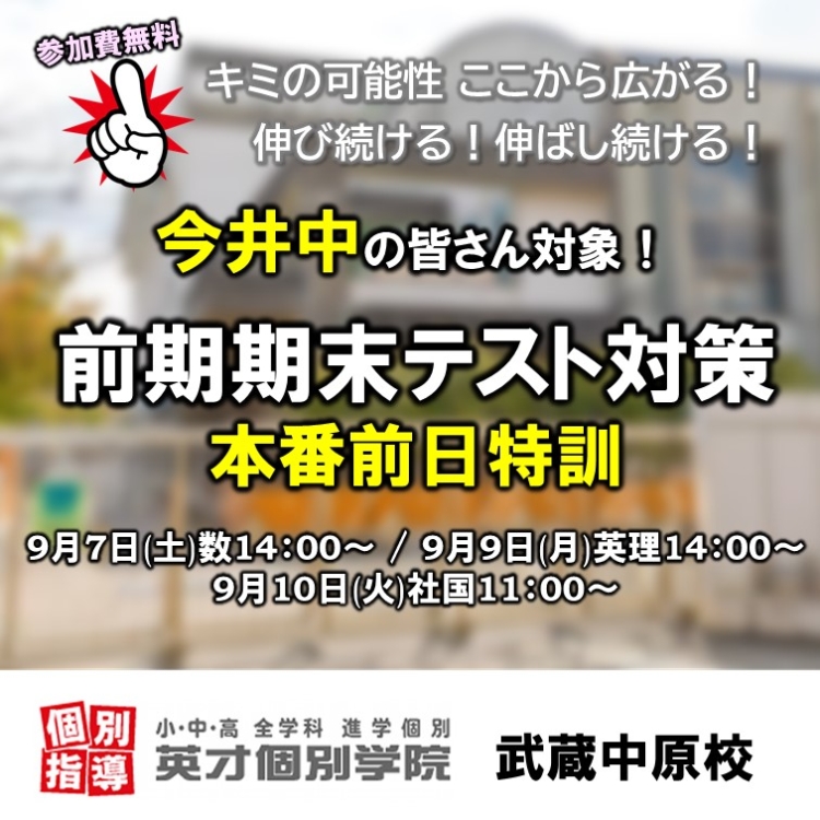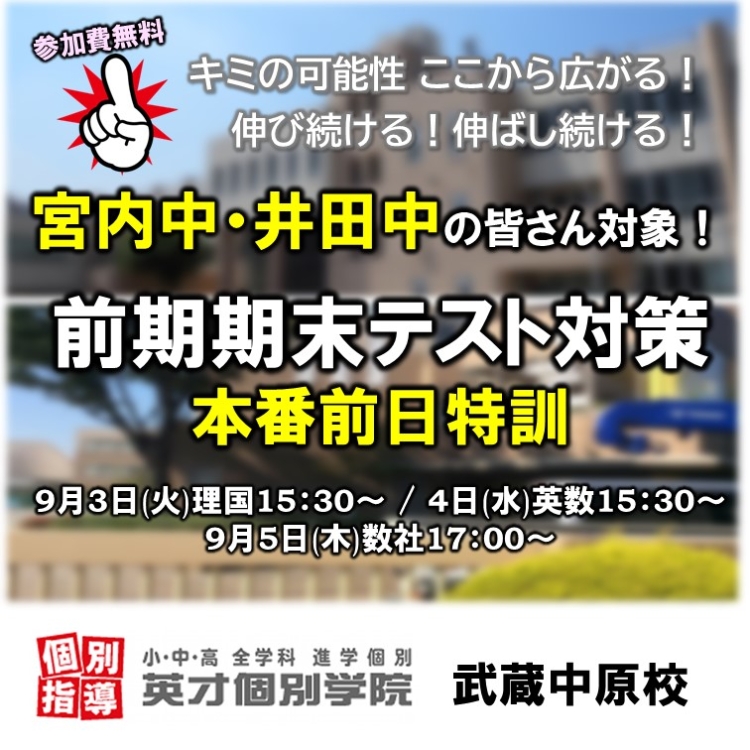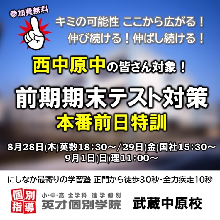 現在、西中原中はテスト本番期間中。そして宮内中・井田中・今井中と続きます。本番前日の特訓や日曜特訓を以下の予定で実施します。すべて参加費無料で教室開放中。塾をお探しの方も、もちろん内部生の方も自由にご参加いただけます!