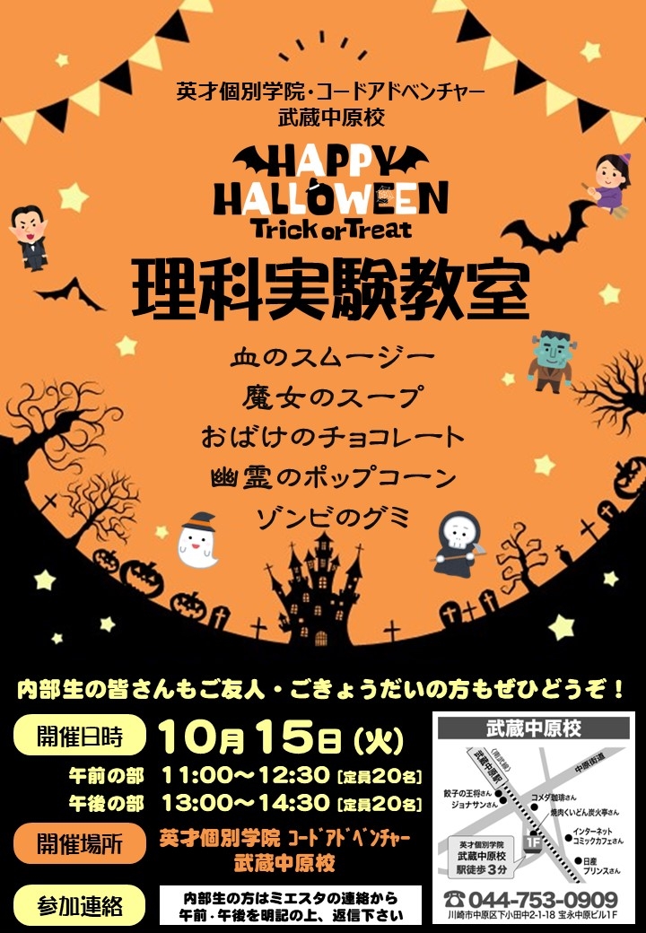 【小学生 10/15(火)】ハロウィン理科実験教室のお知らせ