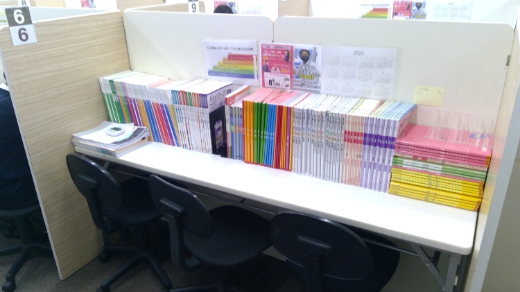積み上げている教材は生徒配布用です。