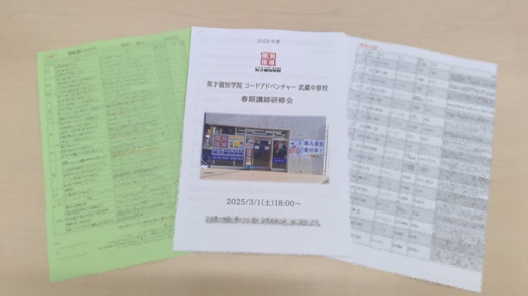 教室長の多喜が用意した研修会でのツールの一部。一人ひとりの在籍生について、新たに仲間入りした生徒たちについて、新年度から利用する教材などについて、打ち合わせや共有をしていきました。