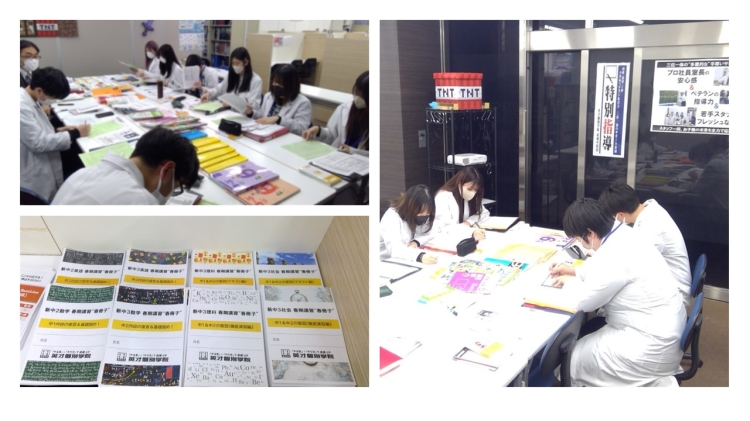 新たに利用するテキストやツール類を用意し、一人ひとりの生徒のファイルにスタッフがしっかりメモを残していく様子。