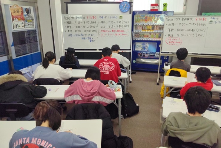 教室のあちこちで、生徒たちが真剣な表情で問題に向き合っています。