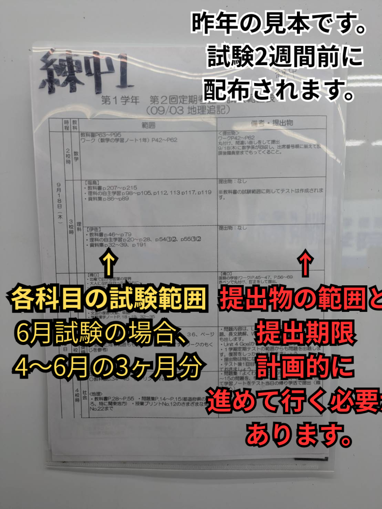 ワークの提出は定期試験前にまとめて指示される事がほとんどです。