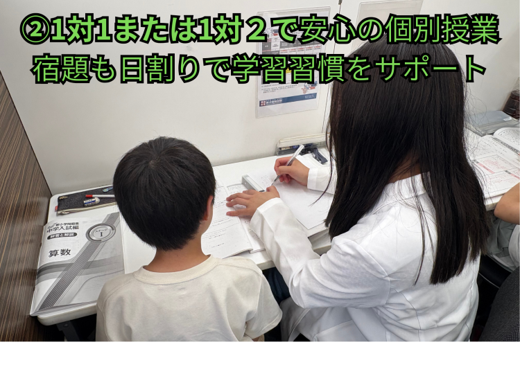 - ② 1対1または、1対2で安心の個別授業。宿題も日割りで学習習慣をサポート