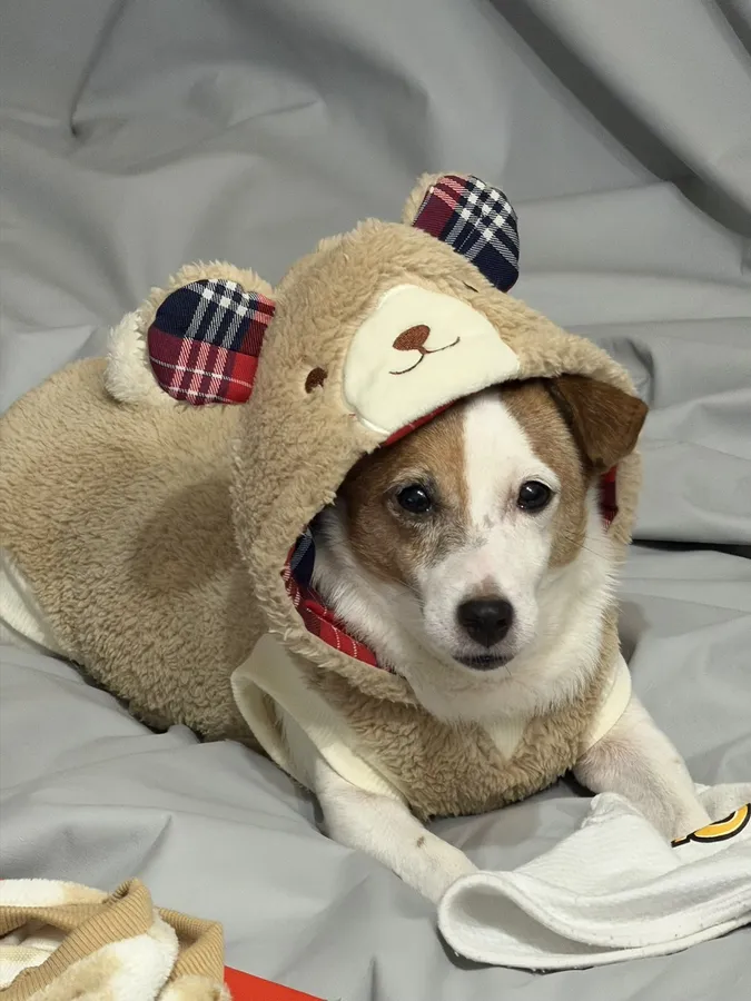 白と茶色の毛が特徴的なかわいいわんちゃんです!