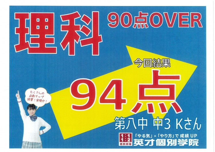八中中3 Kさん 理科94点!
