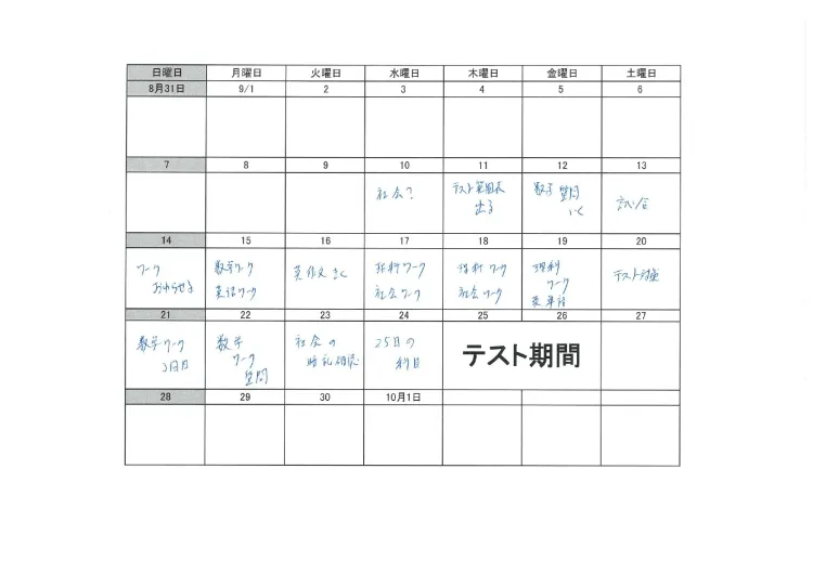 土曜日にテスト対策を行ったうえで、翌日の日曜日に「午前中は自宅で何をするのか」「午後は何をするのか」を具体的に決め、実行してもらいました。