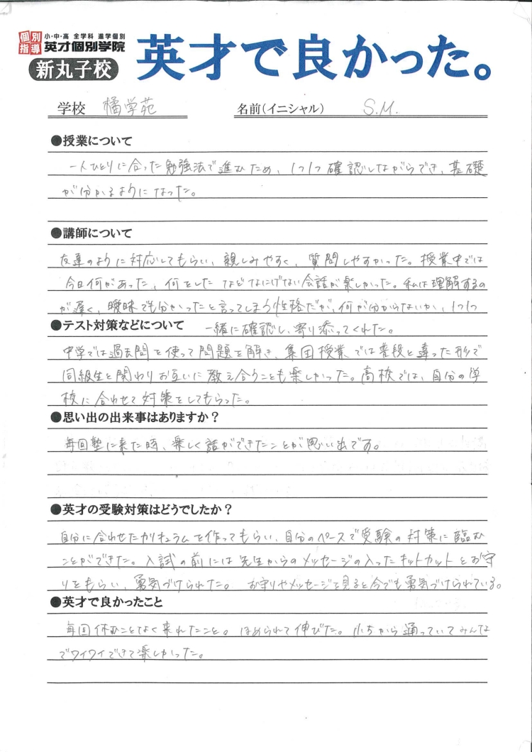 以下、文字に起こしました。 ●授業について一人ひとりに合った勉強法で進めたため、しっかり確認しながらできて、基礎が身につきました。●講師について友達のように対応してもらい、親しみやすく、質問しやすかった。授業中では今日何があった、何をしたなどとだけでなく会話も楽しかった。私は理解するのが遅く、曖昧でも分かったと言ってしまう性格だが、何が分からないか1つ1つ一緒に確認し、寄り添ってくれた。●テスト対策などについて中学では過去問を使って問題を解き、集団授業では普段と違った形で同級生と関わりお互いに教え合うことも楽しかった。高校では自分の学校に合わせて対策をしてもらった。●思い出の出来事はありますか?毎回塾に来た時、楽しく話ができたことが思い出です。●英才の受験対策はどうでしたか?自分に合わせたカリキュラムを作ってもらい、自分のペースで受験の対策に臨むことができました。入試の前には先生からのメッセージの入ったキットカットとお守りをもらい、勇気づけられた。お守りメッセージを見ると今でも勇気づけられている。●英才で良かったこと毎回休むことなく来れたこと。ほめられて伸びた。小5から通っていてみんなでワイワイできて楽しかった。