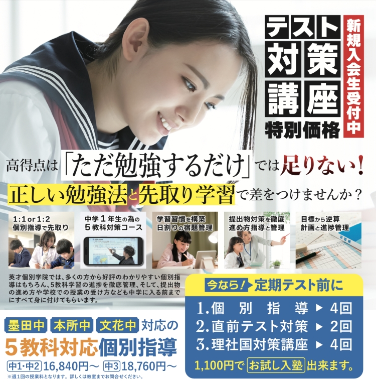 さて、本所中、墨田中、文花中の皆さんは定期テスト約1ヶ月前となりましたね。