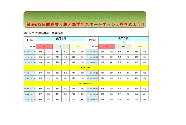 菅生中生限定の無料テスト対策の時間割が決まりました。