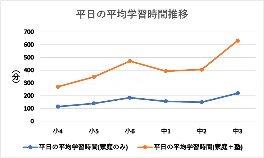 1週間あたりの平日の平均学習時間推移を学年別にまとめたものです。