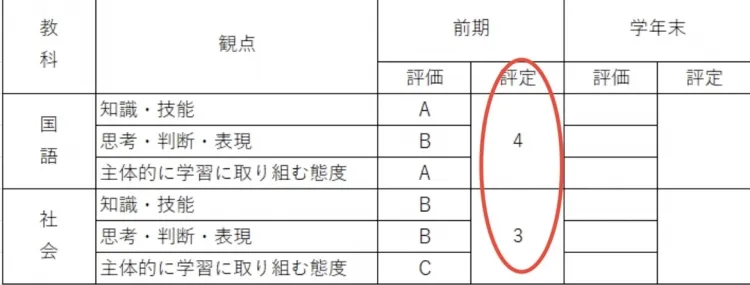 これが「評定(内申点)」と言われるものです。