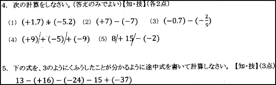 大問4の「正負の計算」は、分数や小数が入っていてもできるようにしましょう。