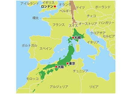 はい、この地図は日本とヨーロッパの緯度を合わせた画像でございます。